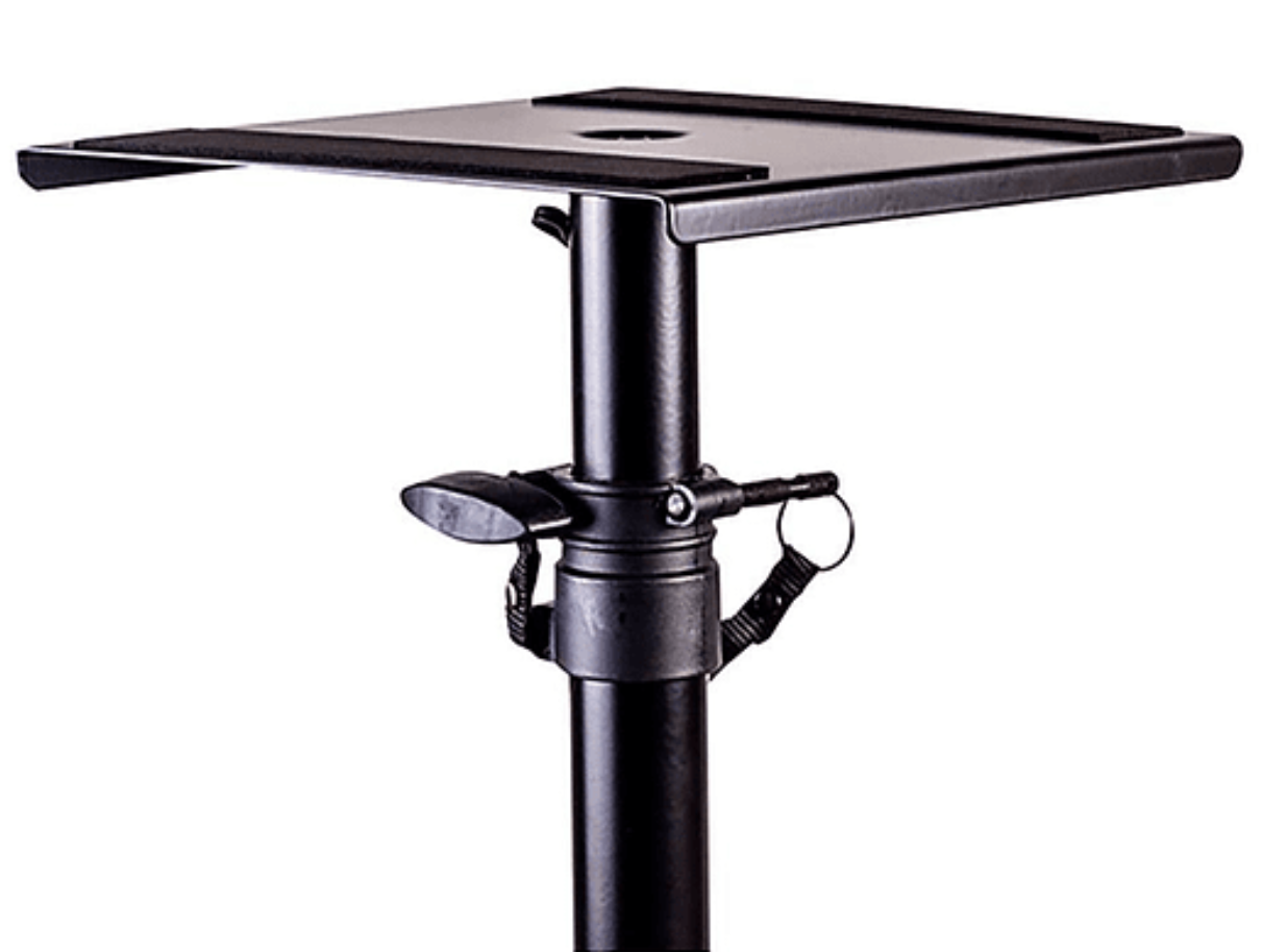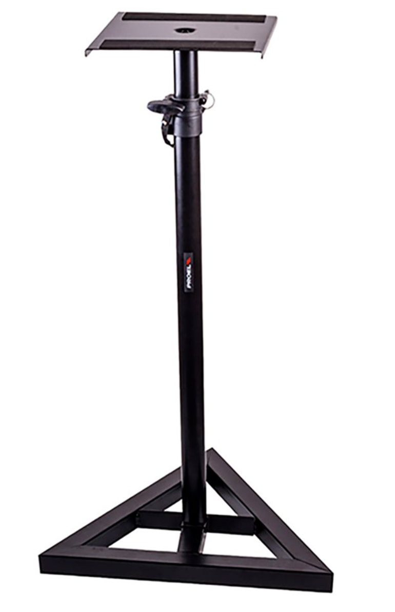 Soporte de monitor de campo cercano de base triangular. Estructura de tubo de acero. Regulable en altura de 850 mm a 1170 mm. Tamaño de la placa superior de 230 mm x 230 mm. Perfecto para grabación en casa y uso de grabación en estudio. Color negro.
