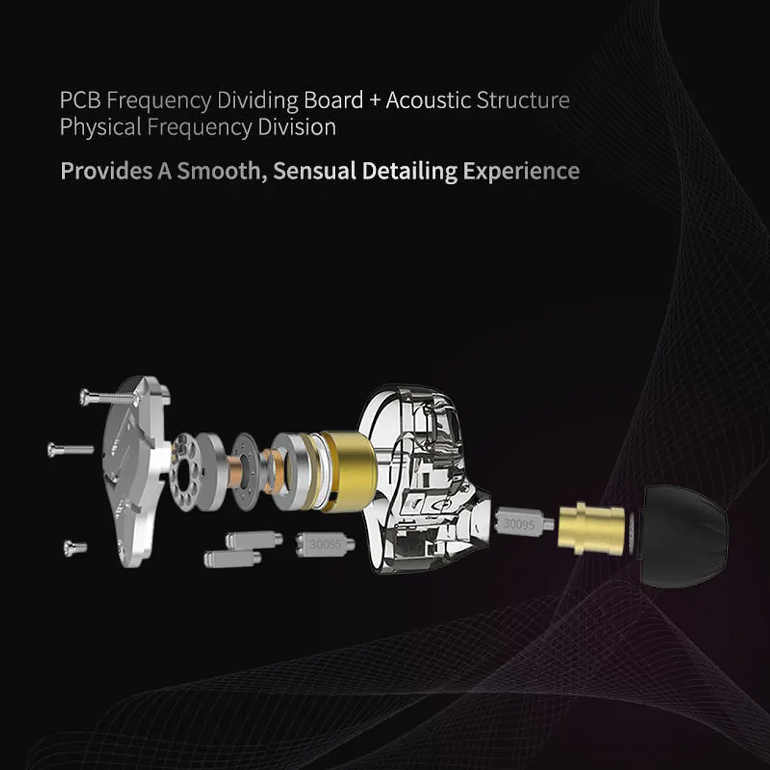 - 5 Drivers por cada lado: 4 Balanced Armatures (2 x 30095 para altos, 2 x 50060 para medios) 1 Double Dynamic de 10mm para bajos.