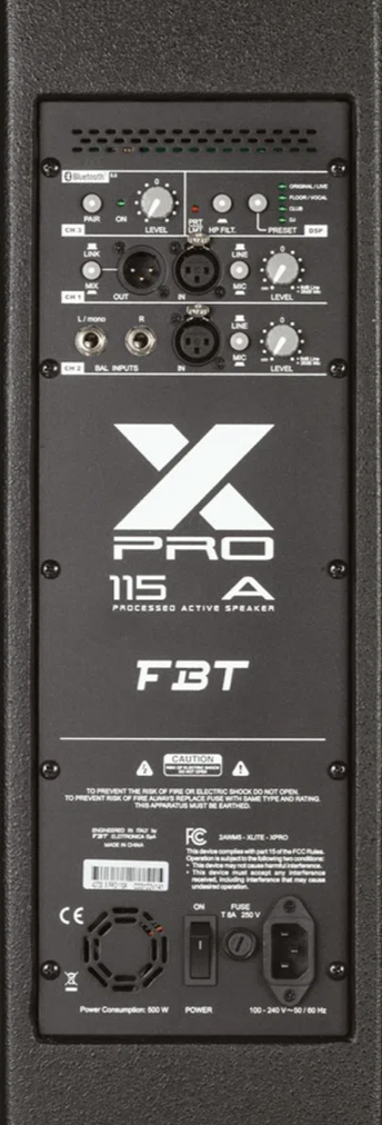 El panel de control cuenta con un mezclador de tres canales con dos entradas de microlínea, una entrada estéreo y un canal dedicado para bluetooth 5.0, dos entradas xlr, entrada estéreo, salida xlr con selector ch1 o mix link, filtro hp, dos selectores de línea de micrófono, selector de preset dsp, bluetooth 5.0 con led de emparejamiento. Los 4 puntos de montaje M10 integrados en el gabinete junto con los soportes de montaje opcionales permiten que el parlante FBT XPRO 115A se monte en la superficie de paredes o techos.
