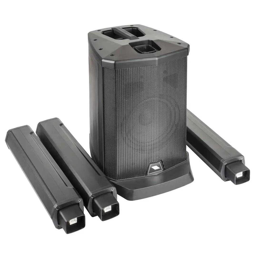 Sistema de columna portátil  con múltiples entradas y un versátil reproductor MP3 con  conectividad BLUETOOTH. Alojado en gabinetes de polipropileno livianos pero ultraduraderos, está compuesto por una  columna con cuatro parlantes de rango completo de 2,5” de alta definición  y un potente  subwoofer de 8” . La  electrónica de última generación  incluye una sofisticada sección de preamplificación con filtrado activo y LIMITADORES DE CLIP duales, y un potente  amplificador de potencia Clase D de 2 canales y 400 W.  La batería de iones de litio incorporada proporciona hasta 8 horas de funcionamiento continuo sin conexión a la red eléctrica para una máxima libertad de uso.